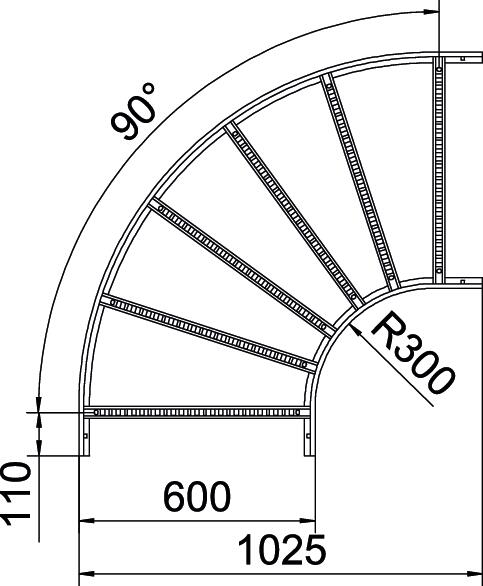 Bogen 90° horizontal mit geschweißter Sprosse für alle Kabelleitertypen mit der Seitenhöhe 110 mm.