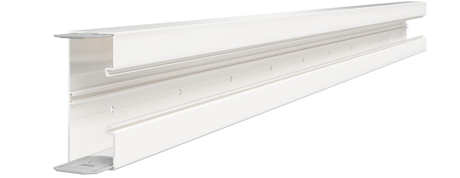 GK Geräteeinbaukanal aus bleifreiem Polyvinylchlorid, geeignet zur Montage direkt auf der Wand oder an Wandkonsolen. Die Befestigung erfolgt über die Regellochung im Kanal. Der GK Geräteeinbaukanal verfügt über ein C-Profil am Boden zur Aufnahme einer Trennwand aus Kunststoff. In den Geräteeinbaudosen der Serie 71GD... können alle Schalterprogramme in Tragring- und Tragbügelbauweise sowie Modul 45-Installationsgeräte installiert werden. Die Systemöffnung beträgt 76,5 mm. Je Kanallänge ist einseitig ein Kupplungspaar vormontiert. Das Oberteil muss separat bestellt werden.