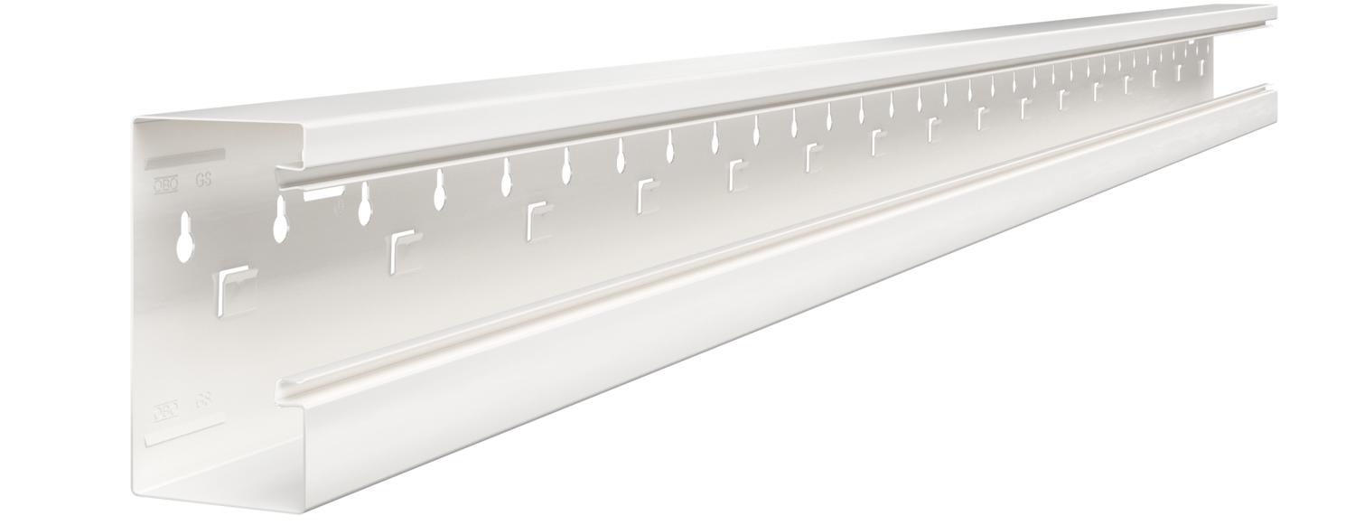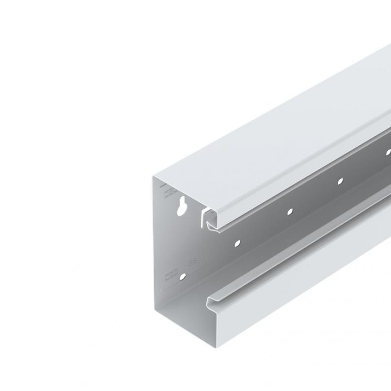 GS Geräteeinbaukanal zur Montage auf der Wand oder an Befestigungskonsolen. Der GS Geräteeinbaukanal verfügt über selbstkontaktierende Rastlaschen zur Aufnahme einer Trennwand aus Stahlblech. Der Potentialausgleich zwischen den Kanalunterteilen erfolgt über die Kupplung. Zwischen Oberteil und Unterteil wird die Schutzmaßnahme und der Potentialausgleich durch die patentierte, selbstkontaktierende Kanalabdeckung gewährleistet. Die Systemöffnung beträgt real 76,5 mm. Das Oberteil muss separat bestellt werden.