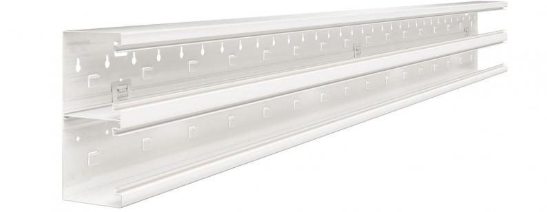GS Geräteeinbaukanal zur Montage auf der Wand oder an Befestigungskonsolen. Der GS Geräteeinbaukanal verfügt über selbstkontaktierende Rastlaschen zur Aufnahme einer Trennwand aus Stahlblech. Der Potentialausgleich zwischen den Kanalunterteilen erfolgt über die Kupplung. Zwischen Oberteil und Unterteil wird die Schutzmaßnahme und der Potentialausgleich durch die patentierte, selbstkontaktierende Kanalabdeckung gewährleistet. Die Systemöffnung beträgt real 76,5 mm. Das Oberteil muss separat bestellt werden.