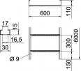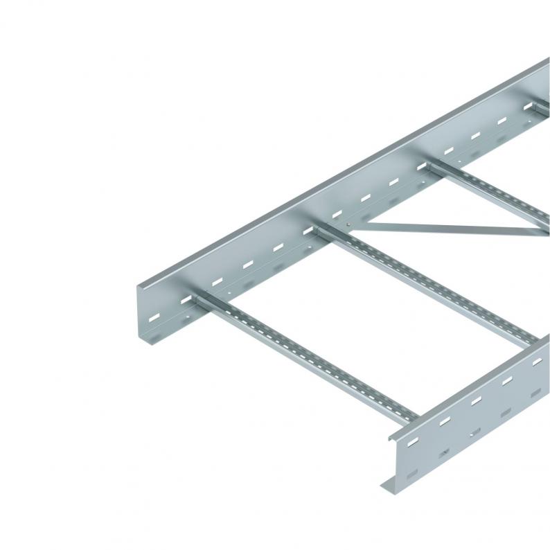 Weitspann-Kabelleiter mit gelochtem Seitenholm in 110 mm Seitenhöhe. Befestigung von Kabeln und Leitungen mit Bügelschelle Typ 2056.
