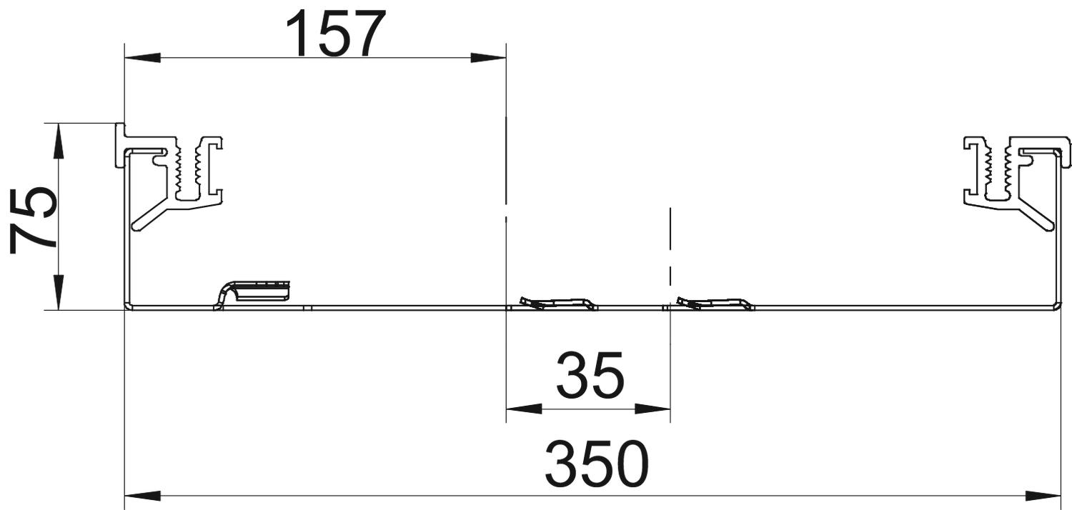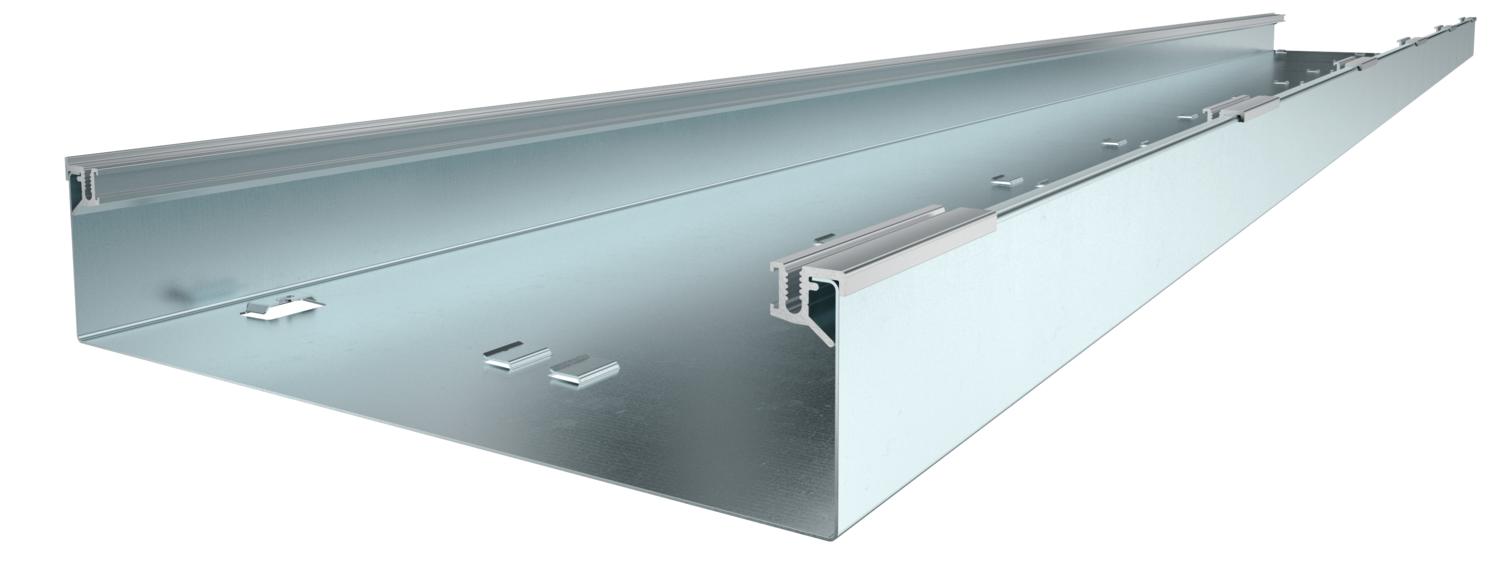 Aufflur-Installationskanal-Unterteil, 1-zügig, für Blind-/Montagedeckel mit einseitiger Abschrägung, mit aufsteckbaren Aluminium-Seitenprofilen zum Auflagern und Befestigen der Kanaldeckel, Bodenwanne mit Haltelaschen für max. 2 einsteckbare, selbstkontaktierende Trennstege und Prägung für Schutzleiteranschlusswinkel. Kanalhöhe geeignet zum Aufbau von Telitanks oder zum Einbau von Geräteeinsätzen der Nenngröße 4, 6, 9.
