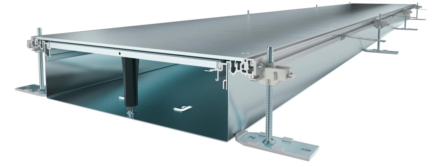 Montagefertige Kanaleinheit mit 3 Blinddeckeln zur Leitungsführung, bestehend aus Kanalunterteil (Bodenwanne mit Seiten- und Bodenbelaganlegeprofilen) und Kanaldeckel. Bodenwanne mit Haltelaschen für die selbstkontaktierende Montage von Trennstegen. Im Lieferumfang enthalten sind 6 höhennivellierbare Befestigungswinkel, 6 Estrichanker und Deckelstoßdichtungen (3 St. bei Kanalnennbreiten 200 und 300) oder nivellierbare Deckelstoßunterstützungen: 3 St. bei Kanalnennbreite 400 und 6 St. bei Kanalnennbreiten 500 und 600. Kanaldeckel bei der Lieferung verschraubt.