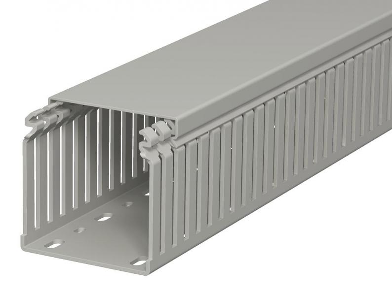 Verdrahtungskanal nach DIN EN 50085-2-3 inkl. Oberteil und Bodenlochung zur waagerechten und senkrechten Verlegung elektrischer Kabel und Leitungen im Schaltschrank. Ausführung als DIN-Kanal. Das Ausbrechen der Stege erfolgt werkzeuglos. Bodenbündiges Ausführen ist durch Sollbruchstellen möglich. Geprüft nach DIN EN 50085-2-3. Sonderlängen auf Anfrage.
