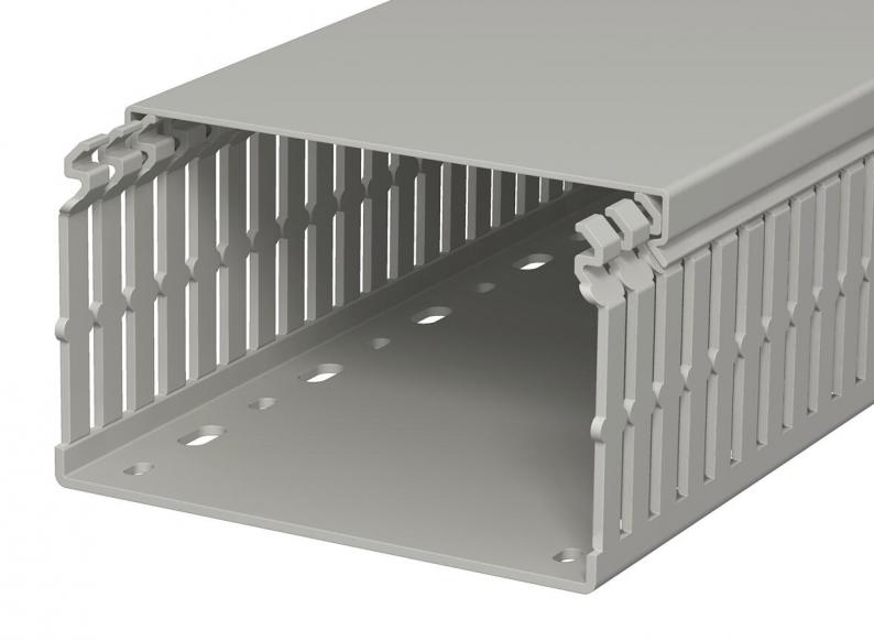 Verdrahtungskanal nach DIN EN 50085-2-3 inkl. Oberteil und Bodenlochung zur waagerechten und senkrechten Verlegung elektrischer Kabel und Leitungen im Schaltschrank. Ausführung als DIN-Kanal. Das Ausbrechen der Stege erfolgt werkzeuglos. Bodenbündiges Ausführen ist durch Sollbruchstellen möglich. Verjüngungen in den Seitenschlitzen verhindern das Herausfallen der Leitungen. Geprüft nach DIN EN 50085-2-3. Sonderlängen auf Anfrage.