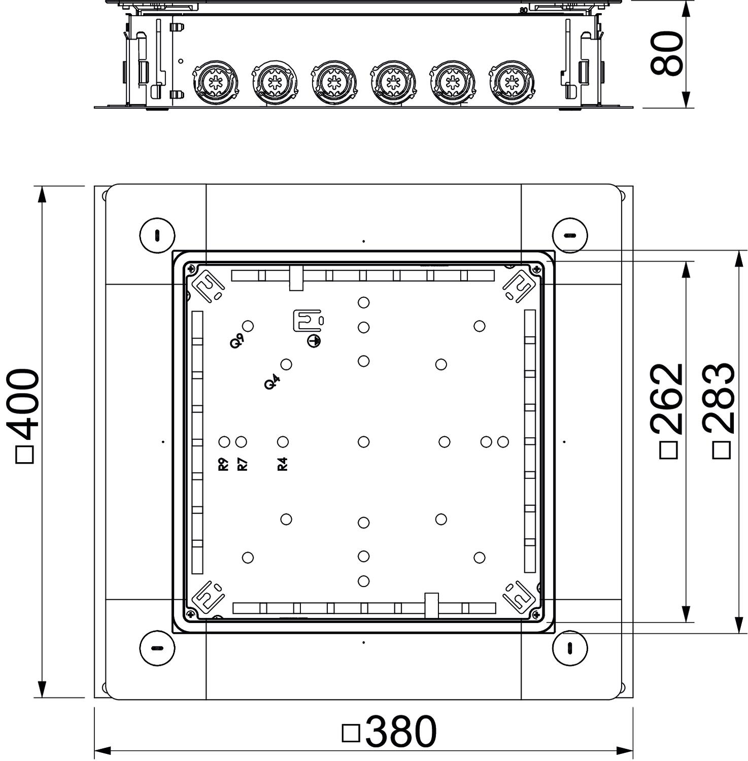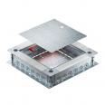 Zug- und Abzweigdose UZD250-4 R mit Seitenwänden aus Stahlblech. Zur Montage von Einbaueinheiten im Montagedeckel (separat zu bestellen). Lässt sich stufenlos mit der Schnellnivellierung auf eine Estrichnennhöhe von 80 - 160 mm nivellieren. Der Estrich kann bündig an die Estrichabzugskante angearbeitet werden. Mit schalltechnischer Entkopplungsmöglichkeit nach der Estrichverlegung und mit Systemzubehör auch für Schwerlastanwendung verwendbar. Einführung der Kabel und Leitungen durch die Rohreinführungen. Rohreinführung pro Seite für je 6 Installationsrohre in den Durchmessern M20, M25 und M32 geeignet.