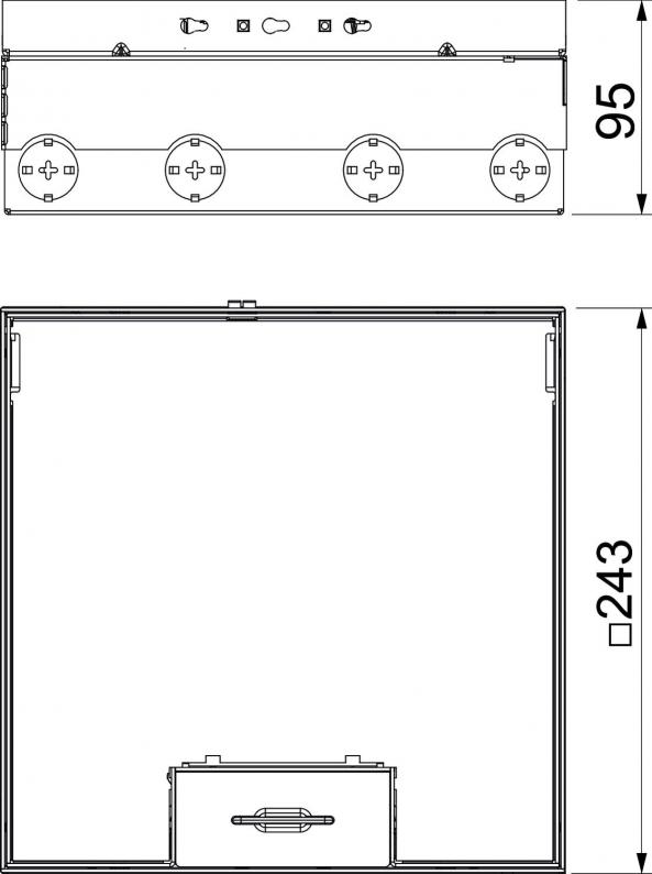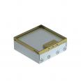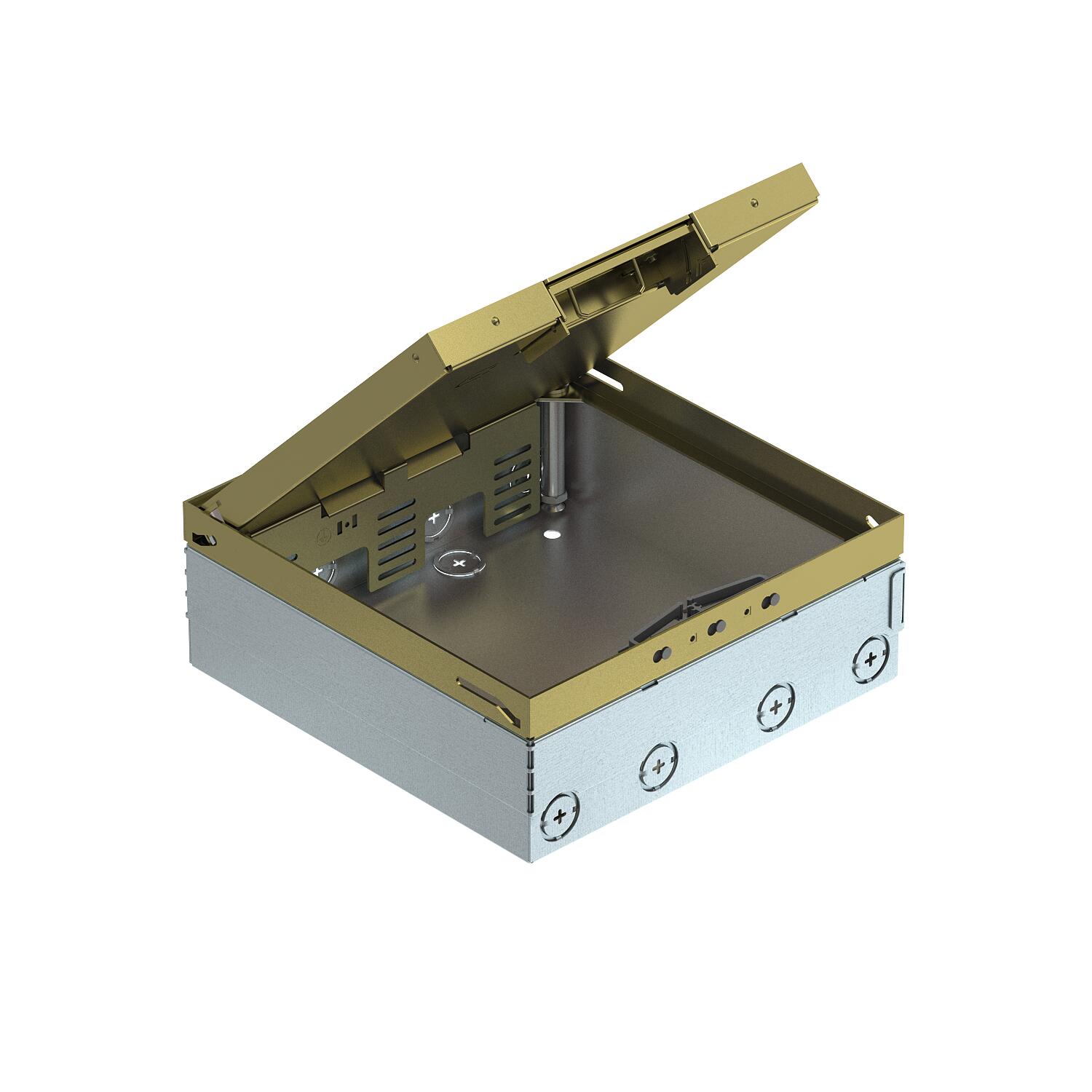Quadratischer Bodentank für den Einsatz in trocken gepflegten Hohlböden und Estrichböden im Innenbereich. Einbaugehäuse mit vorgeprägten Einführungsöffnungen für Rohre (M25). Leergehäuse für bis zu 3 Universalträger UT4 für bis zu 12 Modul 45 ® -Einbaugeräte. Oberteil durch 4 Nivellierstützen auf Oberkante Bodenbelag einstellbar. Die Mindesteinbautiefe beträgt 95 mm, der Nivellierbereich + 30 mm.