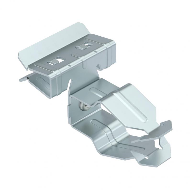 Trägerklammer zum Montieren von Rohren. Offene Rohraufnahme seitlich. Befestigung an Stahträgern durch Aufschlagen.