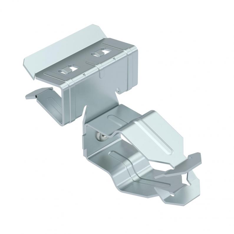 Trägerklammer zum Montieren von Rohren. Offene Rohraufnahme seitlich. Befestigung an Stahträgern durch Aufschlagen.