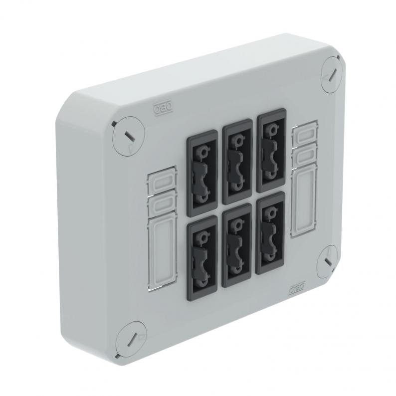 Steckbarer Deckel zum Verschließen von Kabelabzweigkästen, bestückt mit 6 Wieland GST18-Stecksystemen, vorverdrahtet mit Hebelsteckklemmen. Mit Schnellverschluss im Deckel, plombierbar. Halogenfreies Material, UV-resistent. Flammwidrig nach DIN EN 60695-2-11, Prüftemperatur 650°C. Schlagfestigkeit IK07 bei Raumtemperatur. Schutzart IP30.