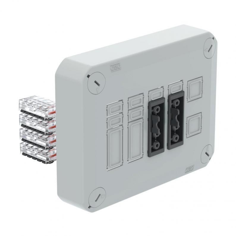 Steckbarer Deckel zum Verschließen von Kabelabzweigkästen, bestückt mit 2 Wieland GST18-Stecksystemen, vorverdrahtet mit Hebelsteckklemmen. Mit Schnellverschluss im Deckel, plombierbar. Halogenfreies Material, UV-resistent. Flammwidrig nach DIN EN 60695-2-11, Prüftemperatur 650°C. Schlagfestigkeit IK07 bei Raumtemperatur. Schutzart IP30.