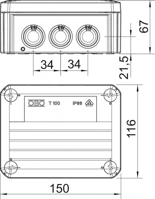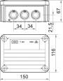Kabelabzweigkasten gemäß DIN EN 60670. Flammwidrig nach DIN EN 60695-2-11, Prüftemperatur 650°C. Schlagfestigkeit IK07 gemäß DIN EN 50102.