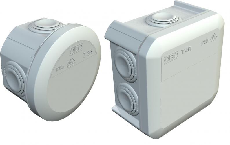 Kabelabzweigkasten gemäß DIN EN 60670. Flammwidrig nach DIN EN 60695-2-11, Prüftemperatur 650°C. Schlagfestigkeit IK07 gemäß DIN EN 50102.