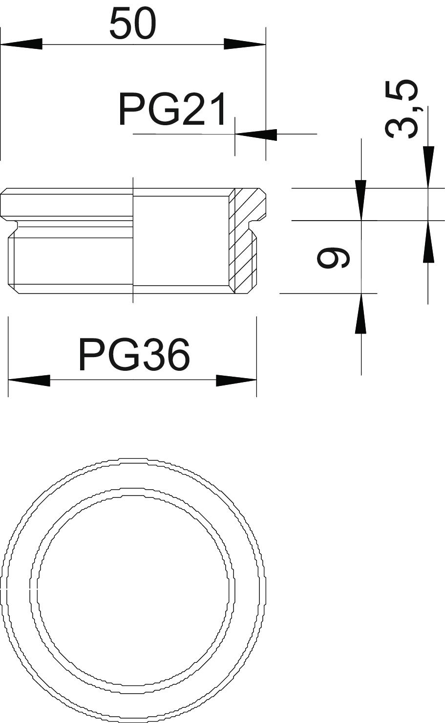 Reduktion (Teil H) nach DIN 46320, mit PG-Gewinde nach DIN 40430, zum Übergang von einem PG-Gewindeloch auf eine kleinere Kabelverschraubung.