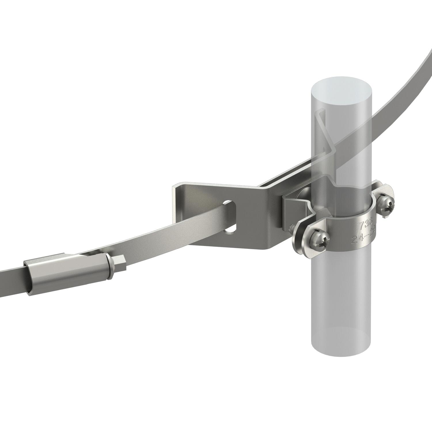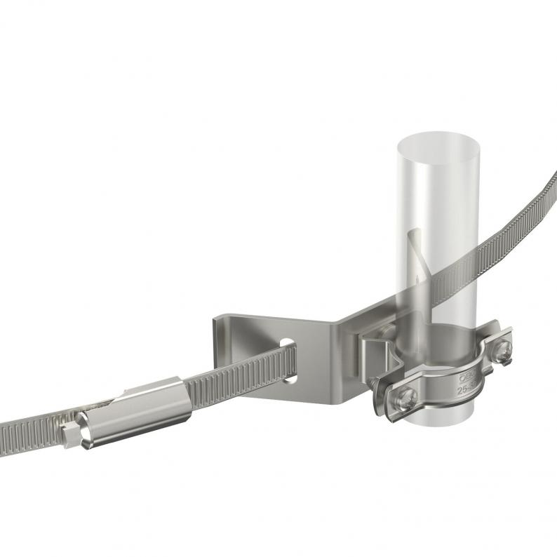 Leitungshalter mit Spannband für isCon®-Ableitung, zum Montieren an Rohren mit ø ≤ 600 mm. Inklusive Federscheiben zur Schraubsicherung gegen Selbstlockern.
