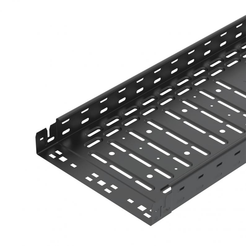 Kabelrinne mit integriertem Schnellbefestigungssystem. Bandverzinkte Oberfläche, pulverbeschichtet in tiefschwarz (RAL 9005). Durchgängige Seitenlochung von 7 x 20 mm für die Installation zusätzlicher Verbindungs- und Montagebauteile. Mit 11-mm-Lochung im Boden für die direkte Gewindestangenabhängung. Nutzlänge 3.000 mm.