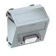 Multimediaträger mit einer D-Sub9-Anschlussbuchse, Kabelauslass schräg, mit Beschriftungsfeld, D-Sub9-Buchse (RS232) mit Schraubanschluss. Trägerplatte mit Rastbefestigung, geeignet für den waagerechten und senkrechten Einbau in die Systemumgebung.