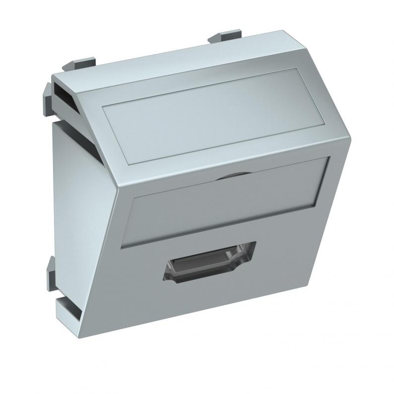 Multimediaträger mit einer HDMI Anschlussbuchse, Kabelauslass schräg, mit Beschriftungsfeld, HDMI Buchse mit Schraubanschluss. Trägerplatte mit Rastbefestigung, geeignet für den waagerechten und senkrechten Einbau in die Systemumgebung.
