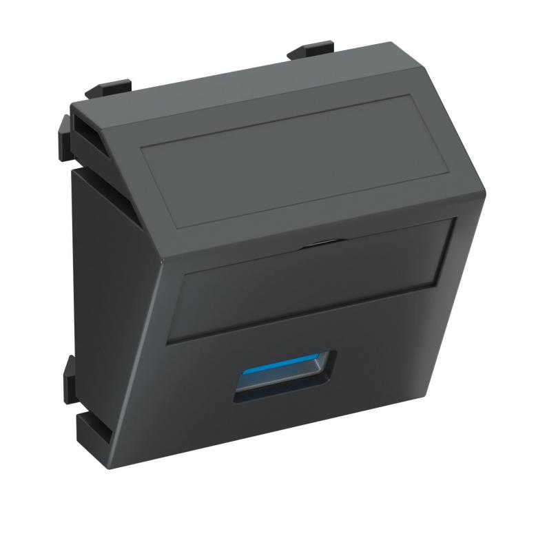 Multimediaträger mit einer USB 3.0-Anschlussbuchse, Kabelauslass schräg, mit Beschriftungsfeld, USB 3.0-Buchse Typ A mit Schraubanschluss. Trägerplatte mit Rastbefestigung, geeignet für den waagerechten und senkrechten Einbau in die Systemumgebung.