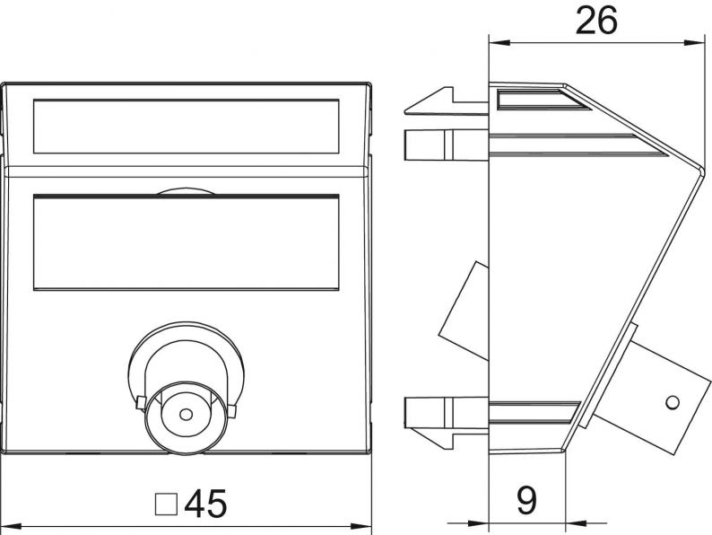 Multimediaträger mit einer BNC Anschlussbuchse, Kabelauslass schräg, mit Beschriftungsfeld, BNC Kupplung in Ausführung Buchse-Buchse. Trägerplatte mit Rastbefestigung, geeignet für den waagerechten und senkrechten Einbau in die Systemumgebung.