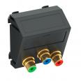 Multimediaträger mit drei Cinch-Anschlussbuchsen für Component Video, Kabelauslass schräg, mit Beschriftungsfeld, drei Cinch-Kupplungen (RCA) in Ausführung Buchse-Buchse, Farbkodierung rot/grün/-blau. Trägerplatte mit Rastbefestigung, geeignet für den waagerechten und senkrechten Einbau in die Systemumgebung.