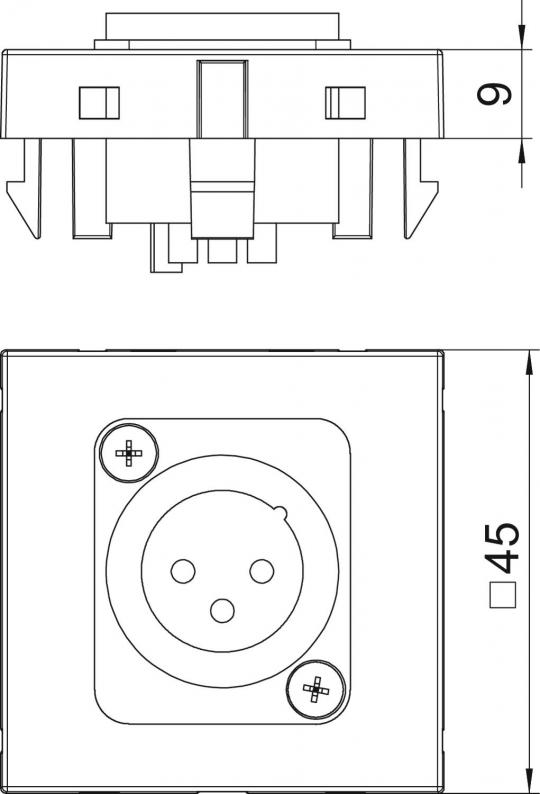 Multimediaträger mit einer XLR-Anschlussbuchse, Kabelauslass gerade, ohne Beschriftungsfeld, XLR-Stecker 3-polig mit Lötanschluss. Trägerplatte mit Rastbefestigung, geeignet für den waagerechten und senkrechten Einbau in die Systemumgebung.