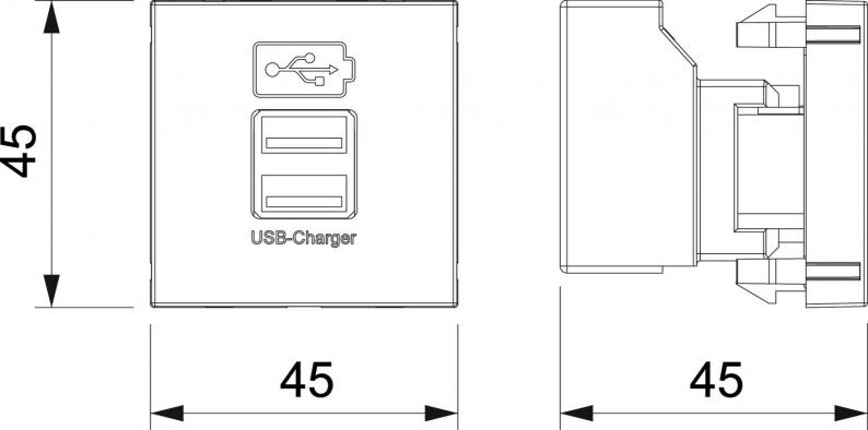 USB-Ladegerät mit zwei USB Typ A-Buchsen, für das Aufladen von 1-2 mobilen Geräten, maximaler Ladestrom 1x 2100 mA oder 2x 1050 mA.