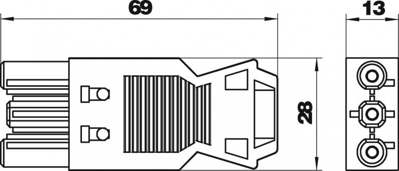 Buchsenteil 3-polig, Typ GST18i mit Schraubanschluss, geringe Bauhöhe (kein Steckplatzverlust in Kombination mit Verteilerblöcken), für Querschnitt 0,75 - 2,5 mm², ein- und feindrähtige Leiter ohne Aderendhülse anschließbar, für Leitungsdurchmesser von 6,5 - 10,5 mm (H05VV, NYM), unmontiert mit Zugentlastung, vor Ort konfektionierbar, 250 V, 16 A.