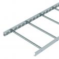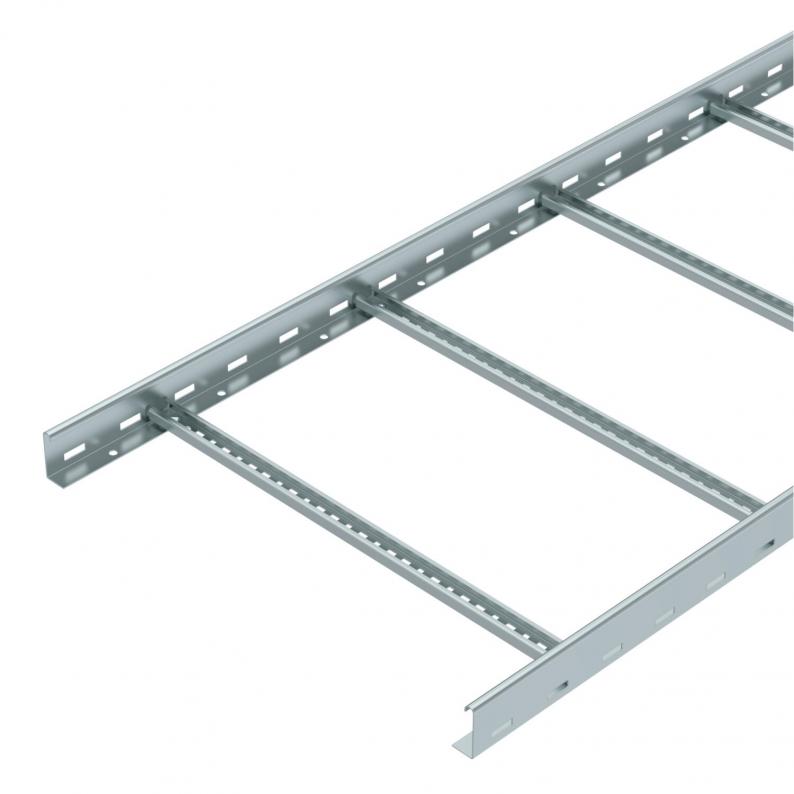 Kabelleiter in Seitenhöhe 60 mm mit eingeschweißten, nach oben offenen C30 Profilsprossen. Eingerollter Seitenholm zur Verstärkung und als Kantenschutz. Die Befestigung auf dem Ausleger erfolgt mit Klemmstücken Typ LKS 40. Das Schlitzmaß der Sprosse beträgt 16,5 mm, die passende Bügelschelle ist der Typ 2056.