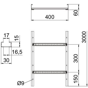 Kabelleiter in Seitenhöhe 60 mm mit eingeschweißten, nach oben offenen C30 Profilsprossen. Eingerollter Seitenholm zur Verstärkung und als Kantenschutz. Die Befestigung auf dem Ausleger erfolgt mit Klemmstücken Typ LKS 40. Das Schlitzmaß der Sprosse beträgt 16,5 mm, die passende Bügelschelle ist der Typ BS-H....