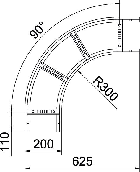 Bogen 90° horizontal mit geschweißter Sprosse für alle Kabelleitertypen mit der Seitenhöhe 110 mm.