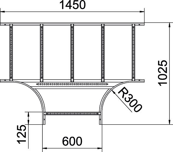 T-Stück, horizontal, mit geschweißter Sprosse für alle Kabelleitertypen mit der Seitenhöhe 60 mm.