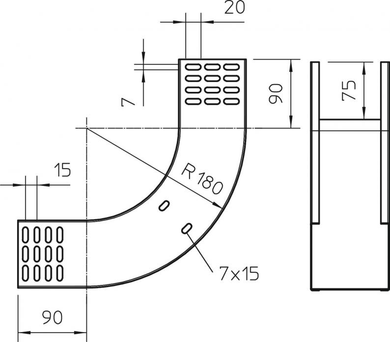 Vertikalbogen 90° in steigender Ausführung für alle Kabelrinnentypen mit der Seitenhöhe 85 mm.