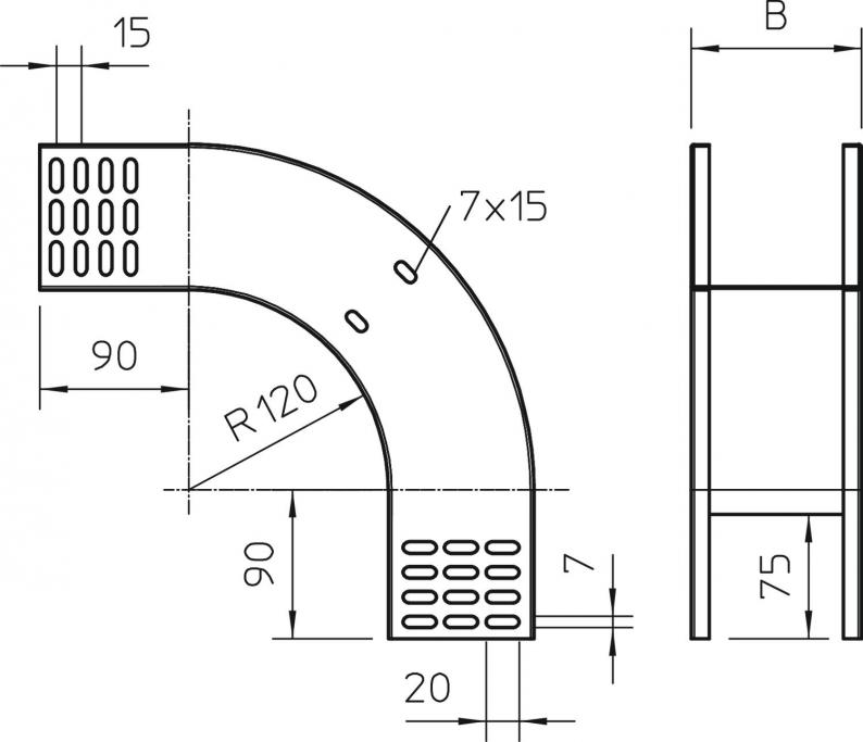 Vertikalbogen 90° in fallender Ausführung für alle Kabelrinnentypen mit der Seitenhöhe 85 mm.