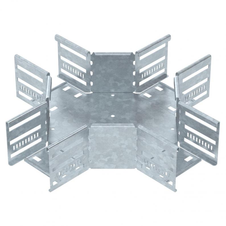 Kreuzung zum Erstellen einer horizontalen Abzweigung, Formteil für rast- und schraubbare Kabelrinnen Seitenhöhe 85 mm. Schraubenlose Montage mit Doppelklemmen oder Schraubverbindung mit Flachrundschrauben FRS und Kombimuttern M6. Einsetzbar im Innen- und Außenbereich. Befestigungsmaterial muss separat bestellt werden.