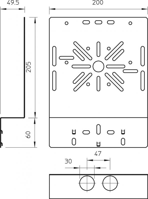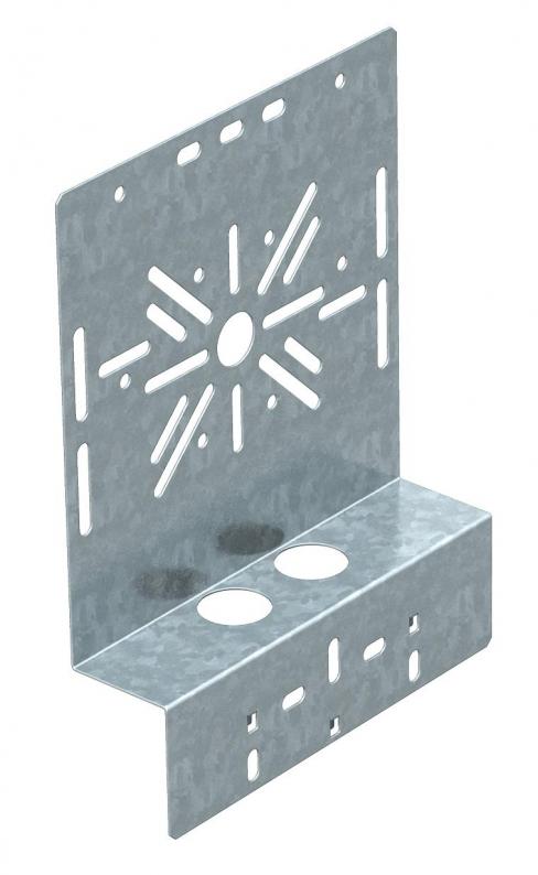 Abgewinkelte Montageplatte zur Befestigung am Seitenholm der Kabelrinne.