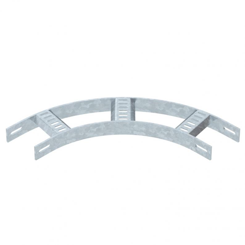 90° Bogen für Schiffsbau-Kabelleiter Typ SL 62 mit der Seitenhöhe 40 mm, mit eingeschweißten, nach unten offenen und gelochten Trapezsprossen.