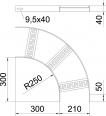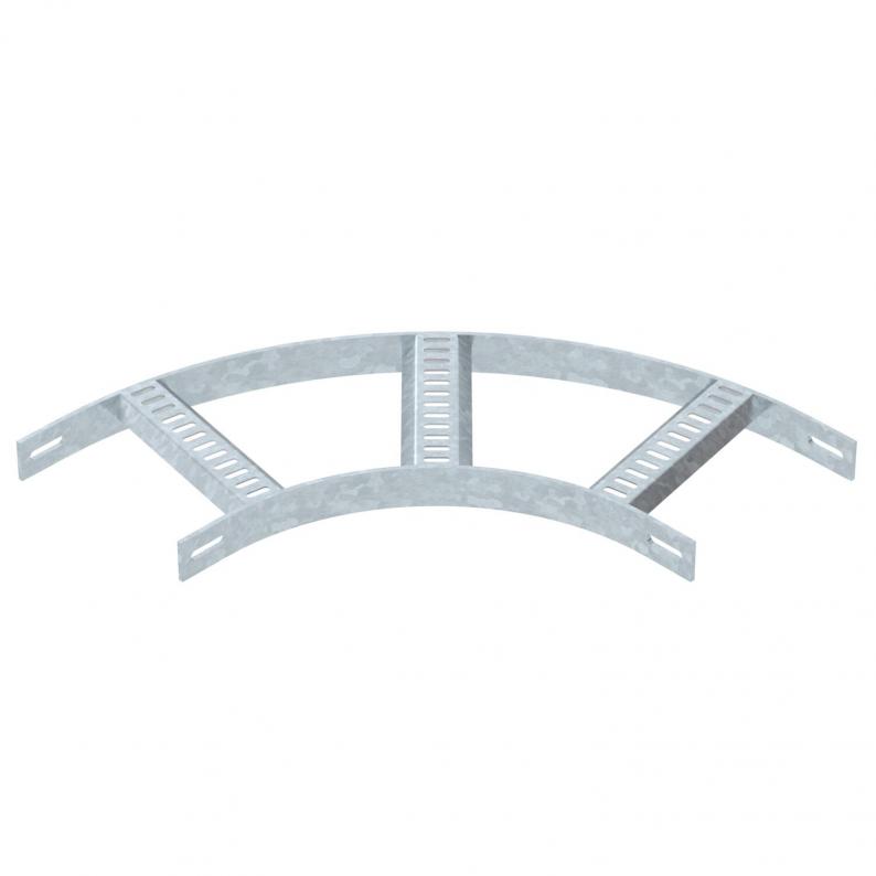 90° Bogen für Schiffsbau-Kabelleiter Typ SL 62 mit der Seitenhöhe 40 mm, mit eingeschweißten, nach unten offenen und gelochten Trapezsprossen.