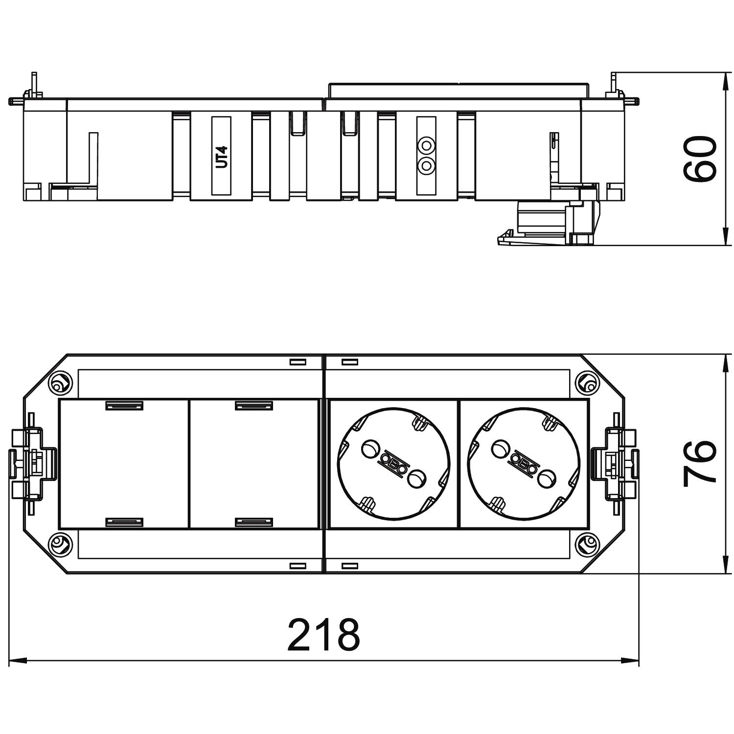 Der anschlussfertige Universalträger UTC4 verfügt über zwei vorinstallierte 33° Schutzkontakt-Steckdosen mit 16 A und zwei Blindabdeckungen für den nachträglichen Einbau von zwei Installationsgeräten der Serie Modul 45 oder Modul 45connect. Passend zu den Verbindungsleitungen VL und den Geräteeinbaueinheiten der Nenngröße R7, R9 und 9.