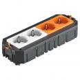 Der anschlussfertige Universalträger UTC4 verfügt über zwei vorinstallierte 33° Schutzkontakt-Steckdosen in reinweiß und zwei vorinstallierte 33° Schutzkontakt-Steckdosen in reinorange mit 16 A. Passend zu den Verbindungsleitungen VL und den Geräteeinbaueinheiten der Nenngröße R7, R9 und 9.