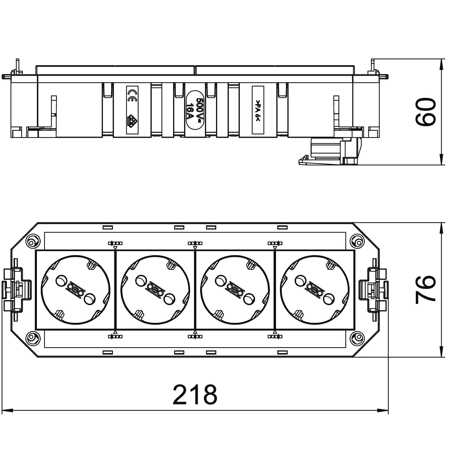 Der anschlussfertige Universalträger UTC4 verfügt über zwei vorinstallierte 33° Schutzkontakt-Steckdosen in reinweiß und zwei vorinstallierte 33° Schutzkontakt-Steckdosen in reinorange mit 16 A. Passend zu den Verbindungsleitungen VL und den Geräteeinbaueinheiten der Nenngröße R7, R9 und 9. Die Schutzkontakt-Steckdosen in reinorange sind durch ein Überspannungsschutz-Modul Typ 3 nach DIN EN 61643-11 gesichert.