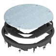 Zugdoseneinsatz zum Blindverschluss einer runden Montageöffnung der Nenngröße R9 in Kanalsystemen sowie in Doppel- und Hohlböden im Innenbereich. Mit Universalbefestigungswinkel. Teppichschutzrahmen aus Polyamid. Bodenbelagstärke max. 12 mm.