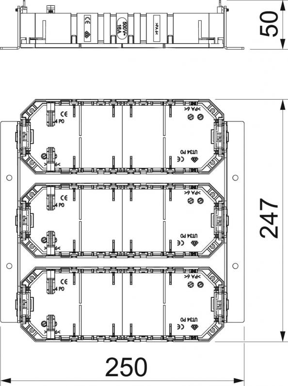 Montageset mit drei Universalträgern vom Typ UT4 zum Einbau in die Unterflur-Zug- und -Abzweigdose UZD350.