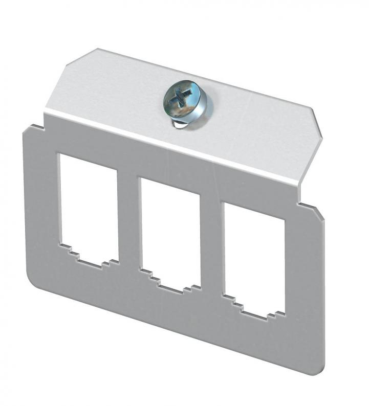 Trägerplatte zur Aufnahme von drei Daten-Anschlussmodulen folgender Typen: BTR: E-DAT; Dätwyler: MS und MS-N; Kerpen: VarioKeystone.
