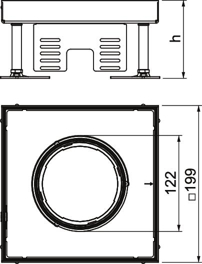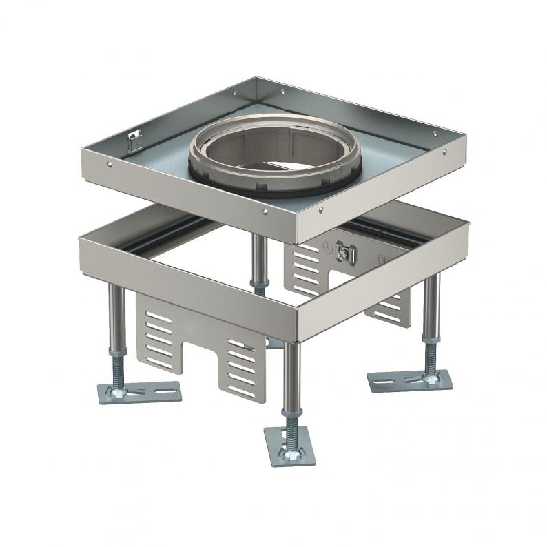Nivellierbare quadratische Kassette für Tubus der Nenngröße 4 für den Einbau von Installationsgeräten in Kanalsystemen, Doppel- und Hohlböden in trocken oder nass gepflegten Fußböden im Innenbereich. Schutzklasse: IP X5.