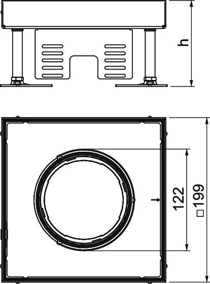 Nivellierbare quadratische Kassette für Tubus der Nenngröße 4 für den Einbau von Installationsgeräten in Kanalsystemen, Doppel- und Hohlböden in trocken oder nass gepflegten Fußböden im Innenbereich. Schutzklasse: IP X5.