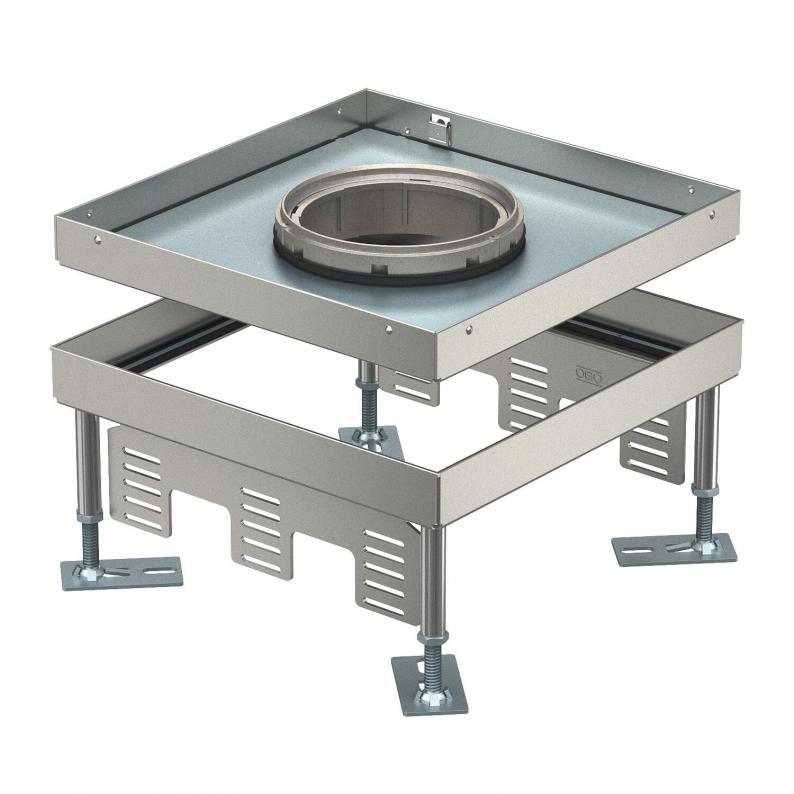 Nivellierbare quadratische Kassette für Tubus der Nenngröße 9 für den Einbau von Installationsgeräten in Kanalsystemen, Doppel- und Hohlböden in trocken oder nass gepflegten Fußböden im Innenbereich. Nur passend für glatte Bodenbeläge.