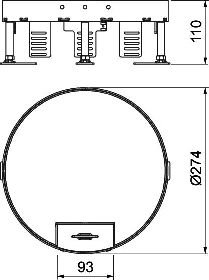Nivellierbare Kassette mit Schnurauslass, 3-zügig. Es können 2 Abdeckplatten APMT2 und eine APMT5 installiert werden. Für den Einbau von 2 Universalträgern UT3 und einem UT4 für 7 Einzel-Installationsgeräte mit Tragering/Tragebügel oder 10 Modul 45-Geräte.