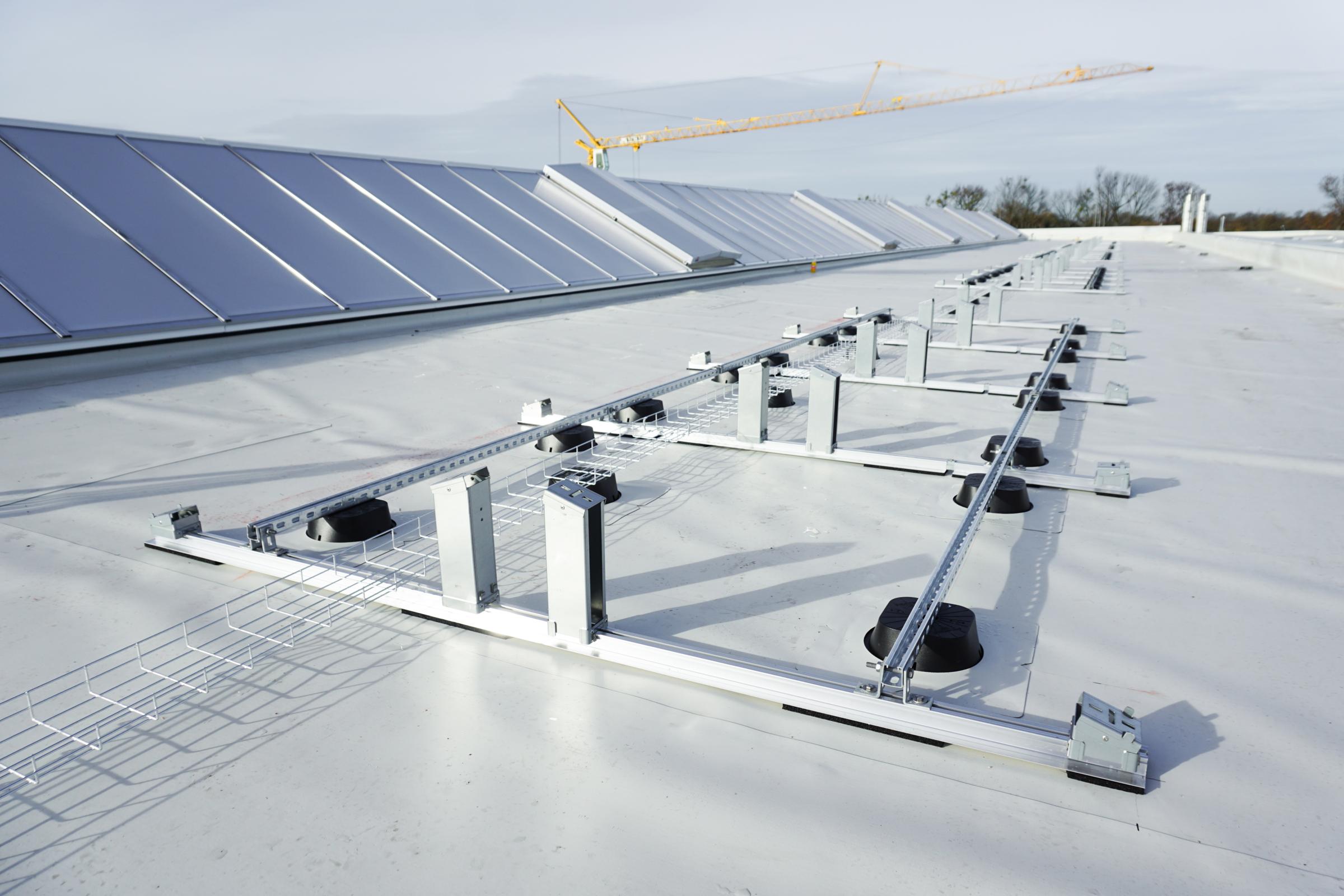 Auf dem UniElektro Zentrallager wurde eine neue PV-Anlage errichtet. Die Leichtbauweise der Dachkonstruktion erwies sich dabei als Herausforderung, die OBO mit der Entwicklung einer ballastfreien Sonderlösung jedoch problemlos meisterte.