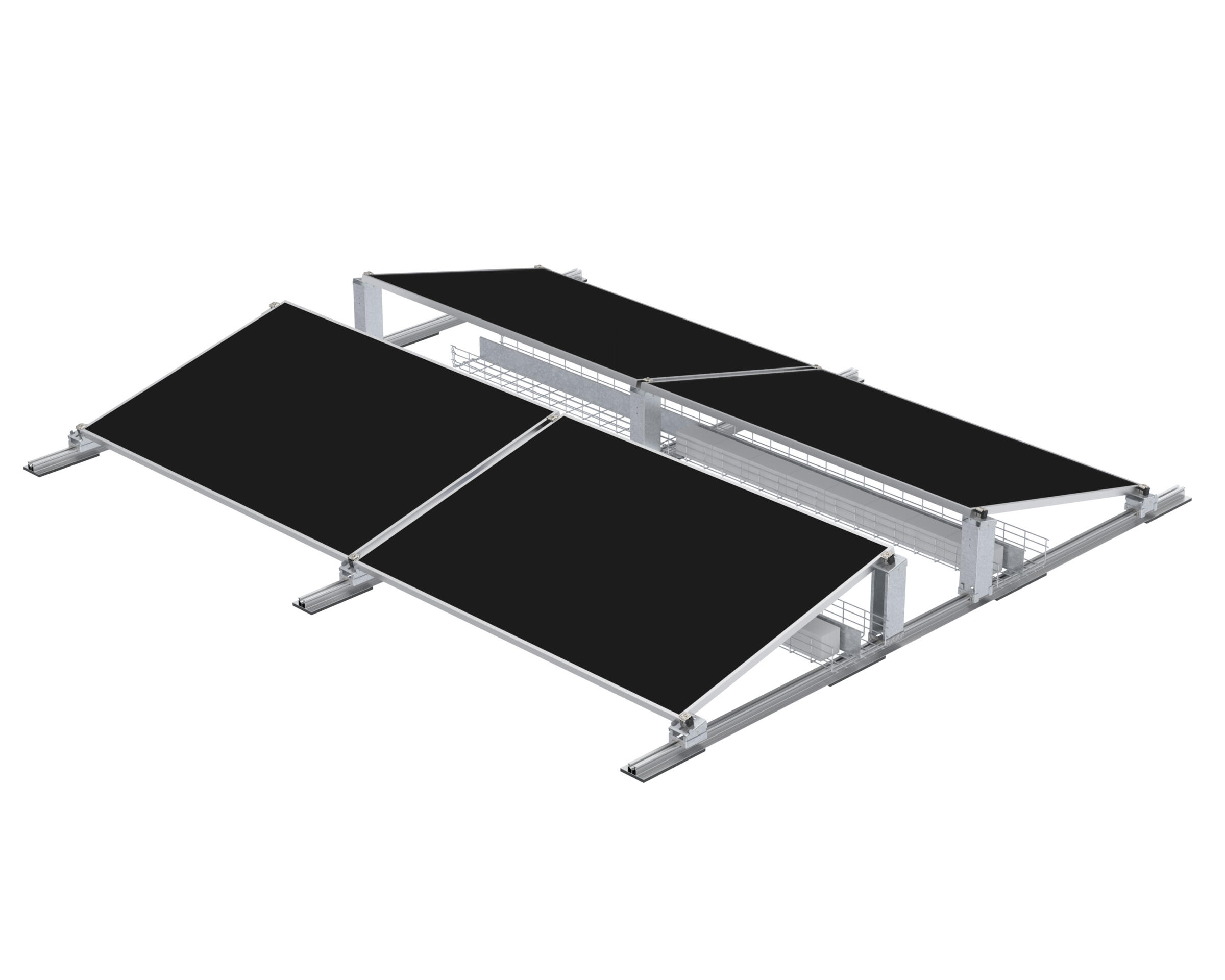 Werden Photovoltaikanlagen auf Flachdächern platziert, hat das einen entscheidenden Vorteil: Die PV-Module können unabhängig von einer vorgegebenen Dachausrichtung montiert werden. Noch mehr Vorteile bietet unser Magic PV Flat Basic System mit einem schlanken Produktportfolio, das größtmögliche Flexibilität bietet. Das Montagesystem für Flachdachanlagen ist langlebig, hochbelbastbar und dank der Magic-Klickverbindung schnell ohne Schrauben oder sonstiges Werkzeug zu montieren. Der flexible Firstspalt ermöglicht eine stufenlose Systemauslegung. Magic PV Flat Basic zeichnet sich durch ein integriertes System zur Kabelverlegung und gleichzeitigen Ballastierung aus. Dies kann beispielsweise mittels Gitterrinnensystemen erfolgen.